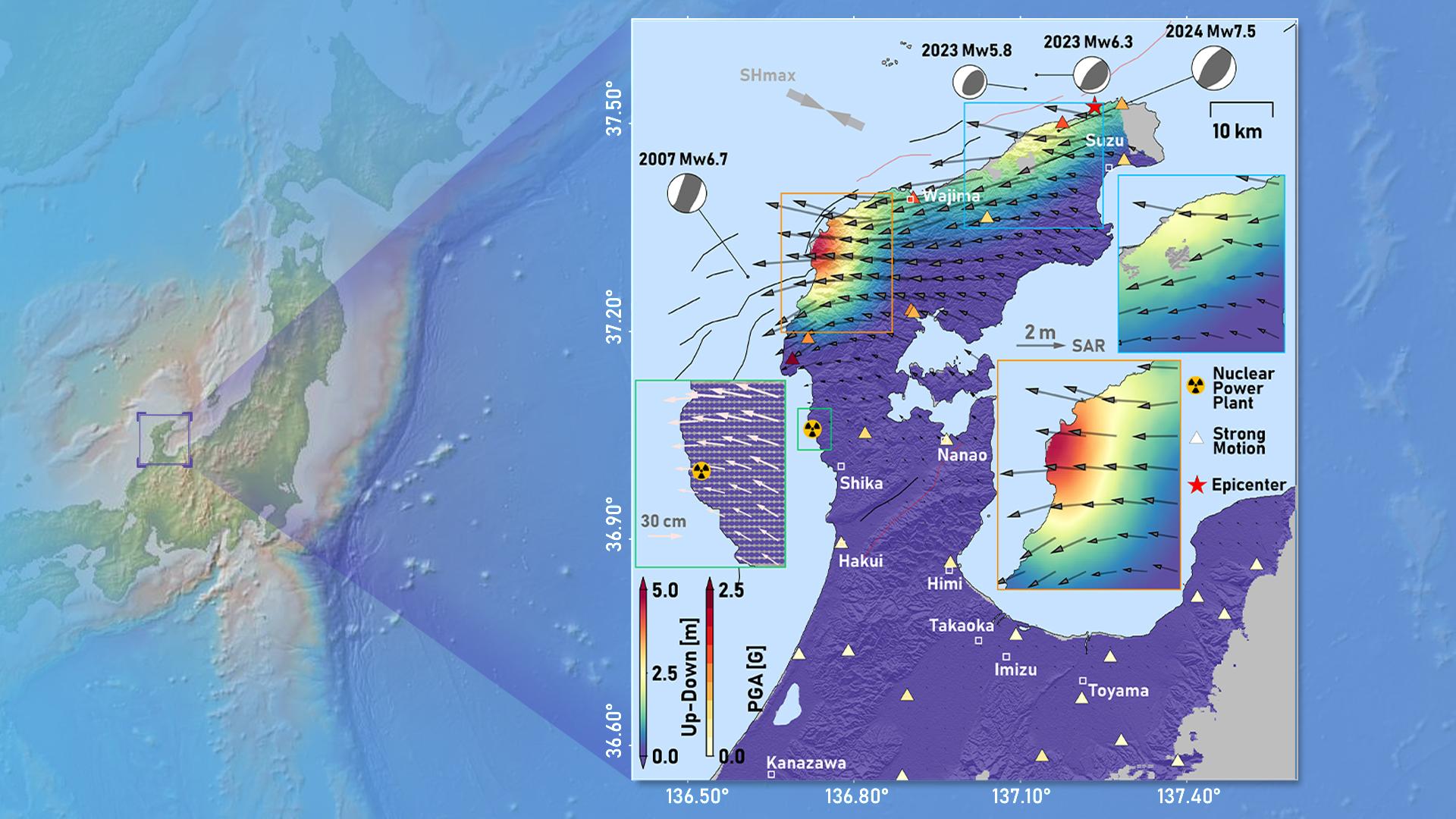 该地震也为研究地震灾害提供了借鉴意义。此次地震造成了最大约5米的地表抬升(图1),将日本能登半岛的海岸线向西北推移了约120米。地震时,地表强震动仪记录到了高达2.6倍重力加速度的地表震动(有记录以来第三大值),而该位置与志贺核电站的距离仅有10公里。地表形变数据揭示志贺核电厂在地震中被向西移动约30厘米,表明了此次地震巨大的破坏性。