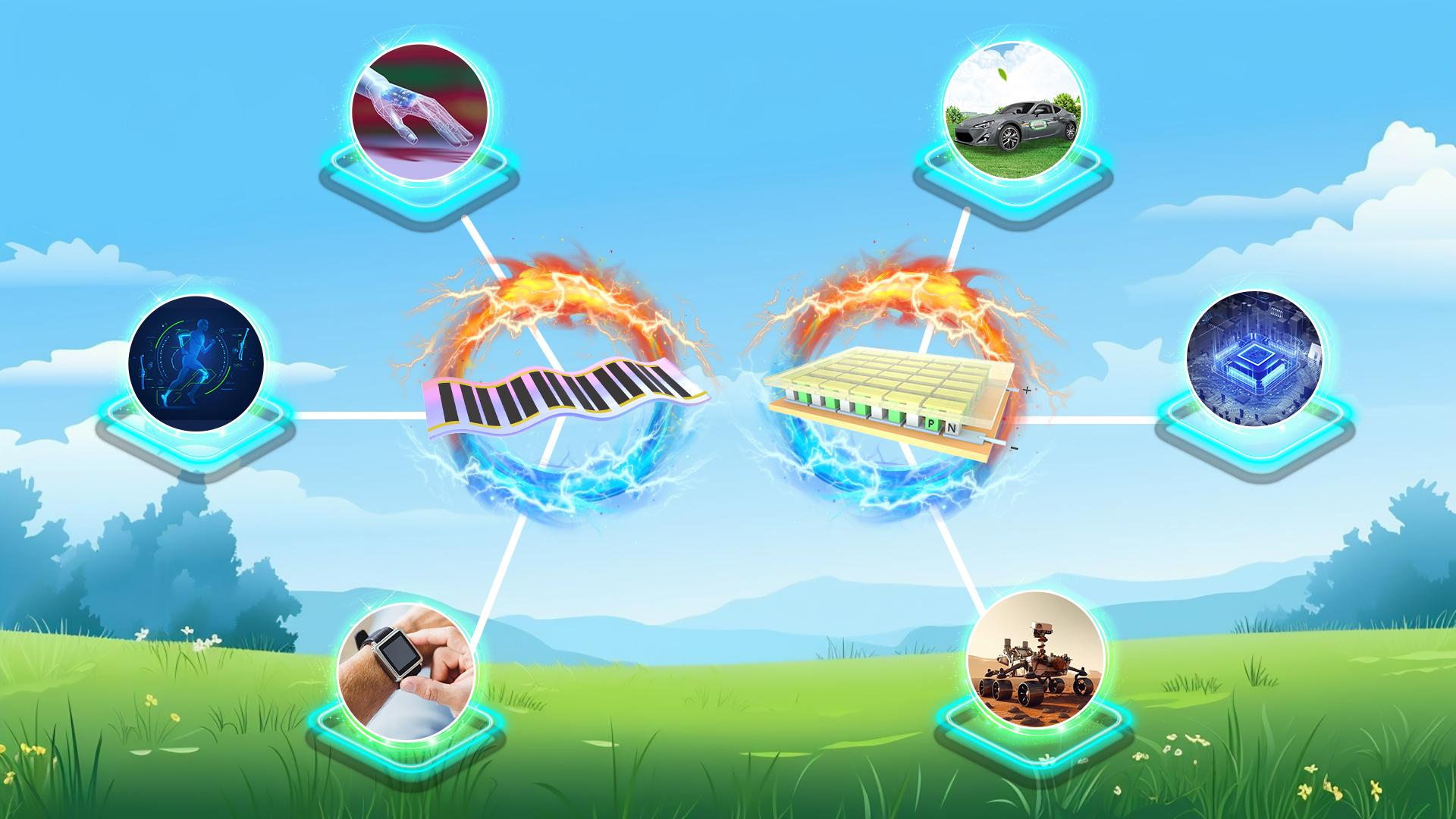 目前的商用热电材料主要是块体材料,这些材料坚硬、体积大,难以加工成贴合热源表面的形状,这限制了它们在收集日常生活中低品味废热方面的应用,从而影响了可持续发展的目标。相比之下,柔性热电材料因其能够匹配弯曲或非平面界面上的热流量,以及能在热电性能、柔韧性和可扩展性之间实现平衡的特点被广泛应用于自供电电子设备和集热器。何佳清团队针对这一挑战,开发了一种具有高密度孪晶结构的Bi0.4Sb1.6Te3薄膜。这种薄膜中的孪晶结构能协同调制载流子浓度、塞贝克系数、迁移率及局部应力的传播,同时实现高热电性能和高柔韧性。该薄膜在常温下具有高达45μW/cm K2的功率因子及1.4的zT值,且在经历1000次弯折循环后,其电性能衰减不到10%,展示了其优异的柔韧性及稳定性。此外,该薄膜具备低成本大面积(100cm2)制备的优势。利用这种薄膜制备的平面型柔性热电发电器件,在温差为56.8K时,能够产生高达69 W/m2的输出功率密度。这种柔性热电材料不仅提供了一个理解无机热电薄膜结构与性能相关性的框架,还为可穿戴电子设备和可持续集热系统的开发提供了新的可能。
