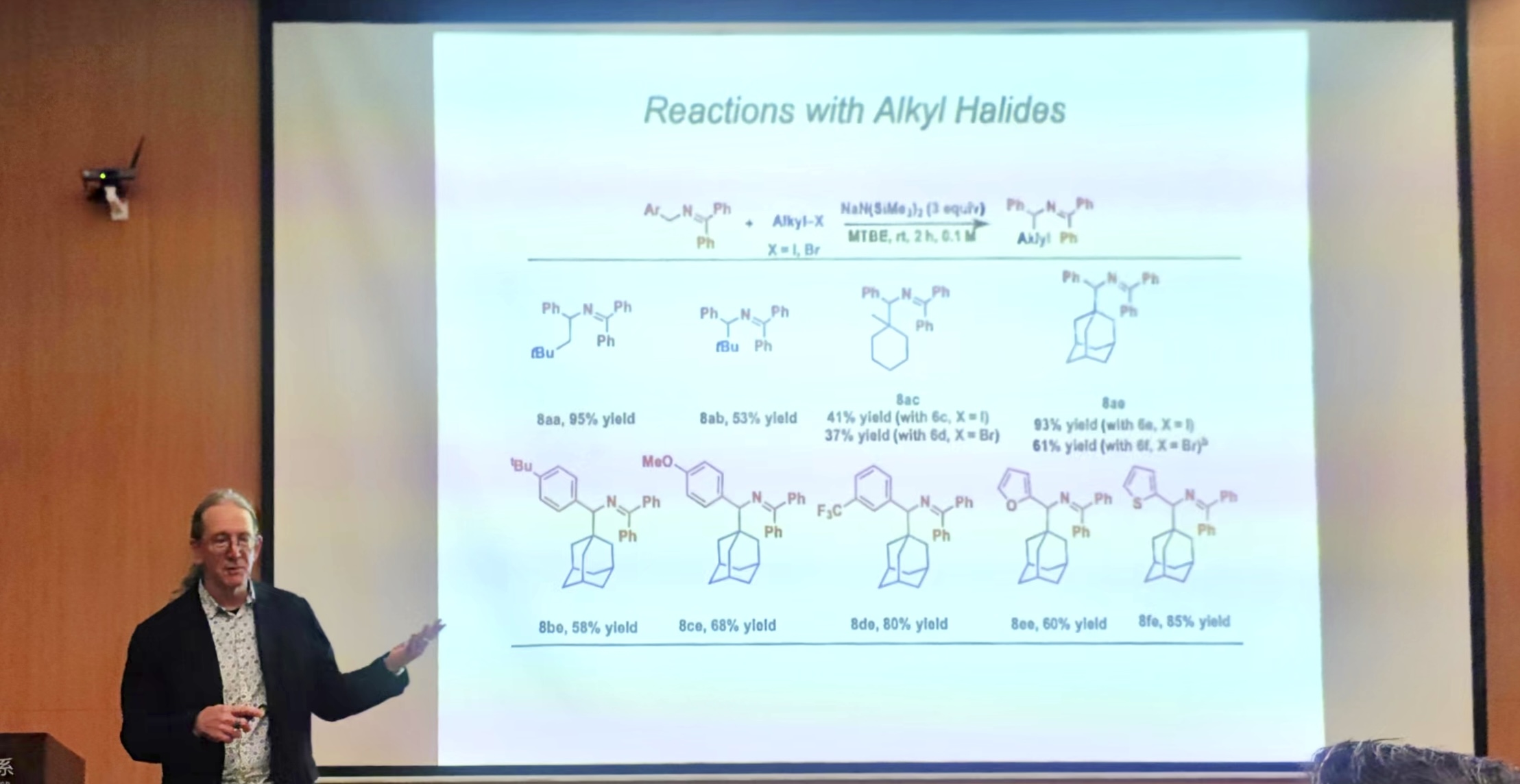 在讲座中,Patrick J. Walsh介绍了他的团队在2-氮杂烯基阴离子方面的研究,这包括单电子或双电子过程。研究团队发现,在没有过渡金属催化剂的条件下,2-氮杂烯基阴离子通过SET反应与芳基卤化物和受阻的烷基碘化物发生交叉偶联,然后经历自由基-自由基偶联过程。这种反应方式被用于制备多种有价值的杂环化合物。后续的研究发现更多有趣的化学反应,包括不寻常的1,2- HAT反应和由2-氮杂烯衍生的2-氮杂烯基中间体的对映选择性金属催化反应。